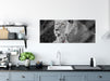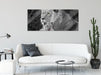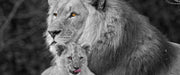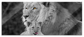 Löwe kuschelt mit kleinem Jungtier, Glasbild Panorama