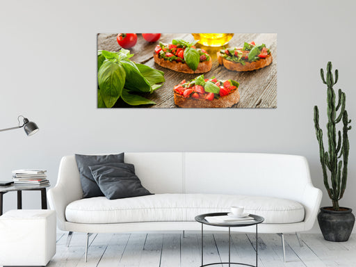 Original Preis64,95 €Köstliche Tomaten Bruchetta, Glasbild Panorama