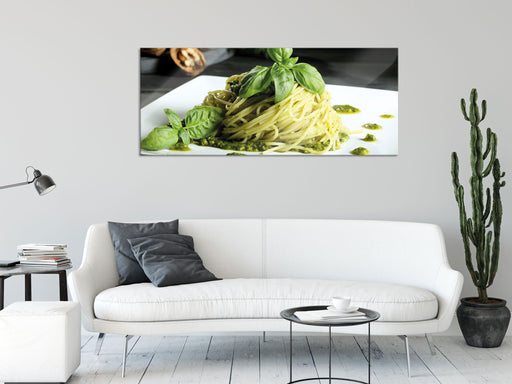 Original Preis64,95 €Spaghetti mit grünem Pesto, Glasbild Panorama