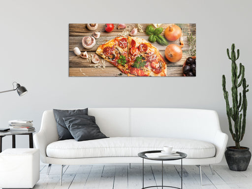 Original Preis64,95 €Pizza mit Schinken und Pilzen, Glasbild Panorama