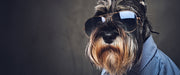 Lustiger Hund mit Hemd und Sonnenbrille, Glasbild Panorama