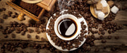 Kaffee mit Kaffeemühle, Glasbild Panorama