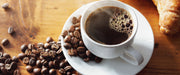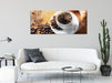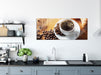 Tasse Kaffee mit Bohnen und Croissant, Glasbild Panorama