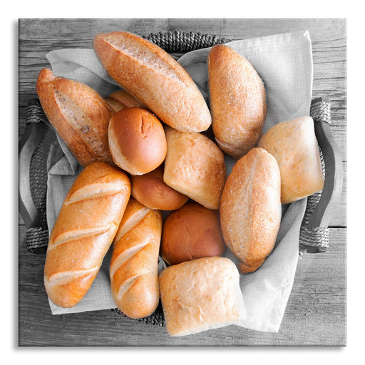 Original Preis34,95 €frische Brötchen in Korb, Glasbild Quadratisch