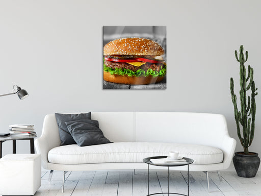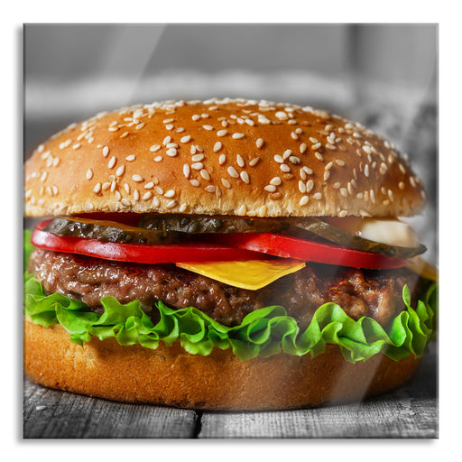 Original Preis34,95 €appetitlicher Cheeseburger, Glasbild Quadratisch