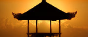 Pagode in Bali im Sonnenuntergang, Glasbild Panorama