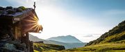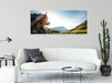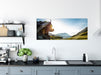 Almhütte am Bach bei Sonnenuntergang, Glasbild Panorama