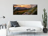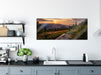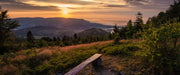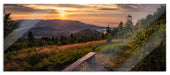 Bank auf Berggipfel bei Sonnenuntergang, Glasbild Panorama
