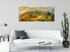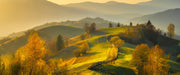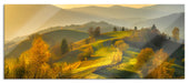 Hügelige Herbstlandschaft bei Sonnenuntergang, Glasbild Panorama
