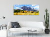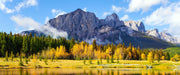 Kanadischer Herbstwald und Berge am See, Glasbild Panorama