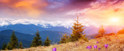Krokusse auf Hochalmwiese in Alpen, Glasbild Panorama