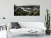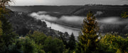 Nebel über Fluss bei Sonnenaufgang B&W Detail, Glasbild Panorama