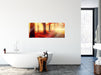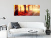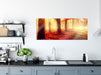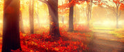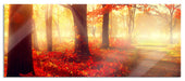Sonnenstrahlen durch rote Herbstbäume, Glasbild Panorama