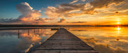 Steg am See bei Sonnenuntergang, Glasbild Panorama