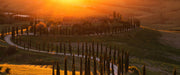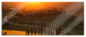 Straße in der Toskana im Sonnenuntergang, Glasbild Panorama