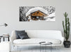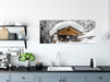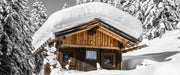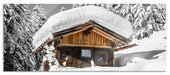 Verschneite Skihütte in Alpenwald B&W Detail, Glasbild Panorama