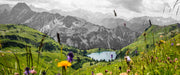Wiesenblumen in den Bergen B&W Detail, Glasbild Panorama