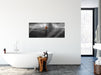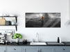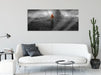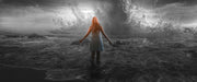 Frau am Strand vor düsterem Tornado B&W Detail, Glasbild Panorama