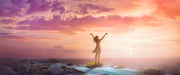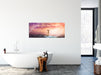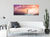 Frau begrüßt den Sonnenaufgang am Meer, Glasbild Panorama