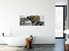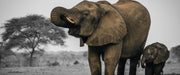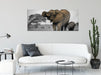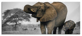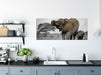 Elefantenkuh mit Jungem am Wasserloch B&W Detail, Glasbild Panorama