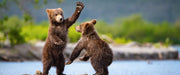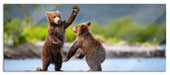 Junge Braunbären spielen am Fluss, Glasbild Panorama