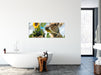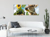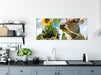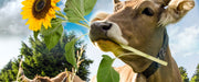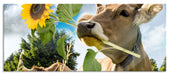 Nahaufnahme Kuh mit Sonnenblume im Maul, Glasbild Panorama