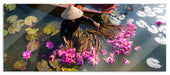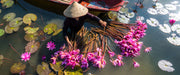 Wasserlilienernte mit Boot in Vietnam, Glasbild Panorama