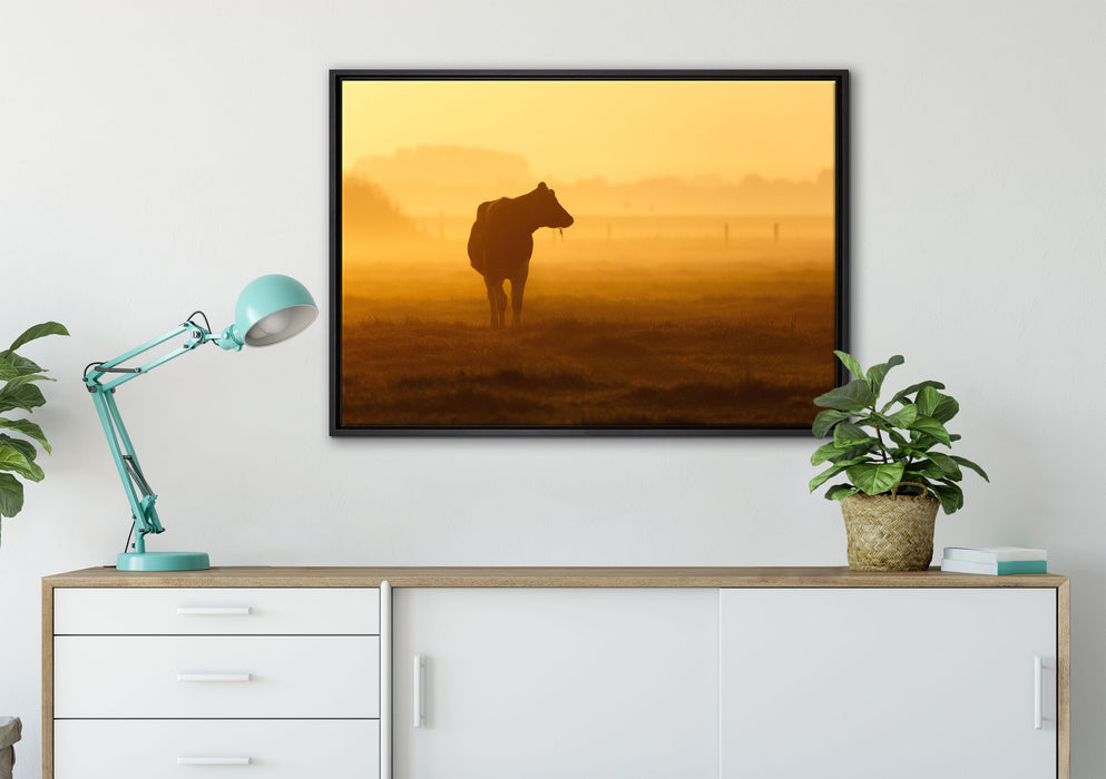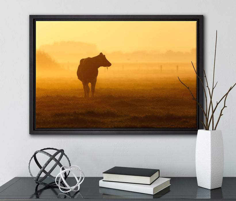 eine fressende Kuh auf der Weide, Leinwandbild mit Bilderrahmen
