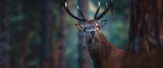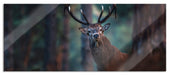 Hirsch im Wald schaut neugierig in die Kamera, Glasbild Panorama