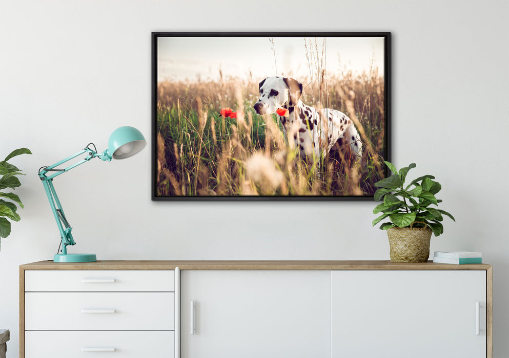 Neugieriger Hund im Feld, Leinwandbild mit Bilderrahmen