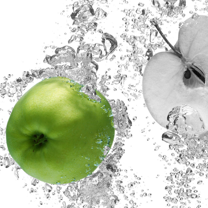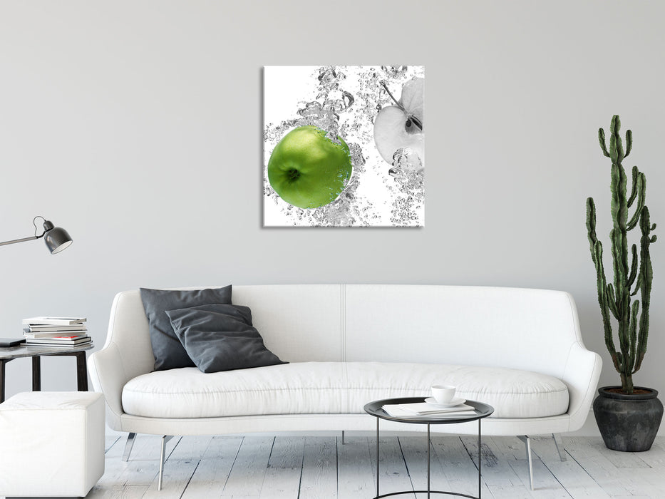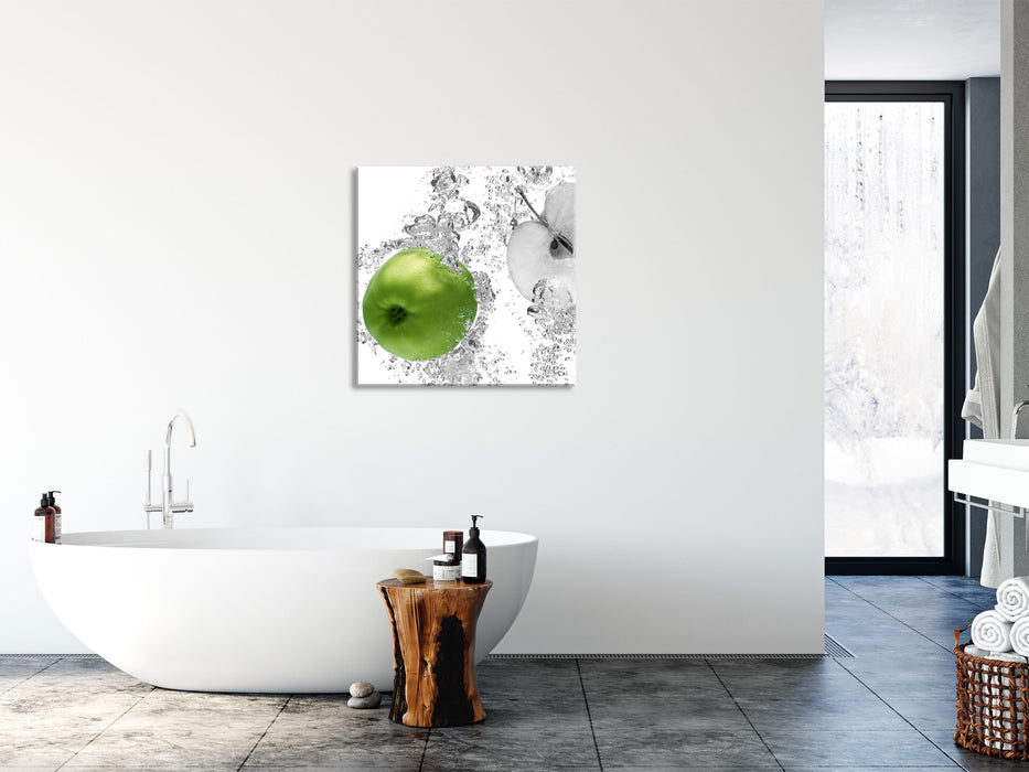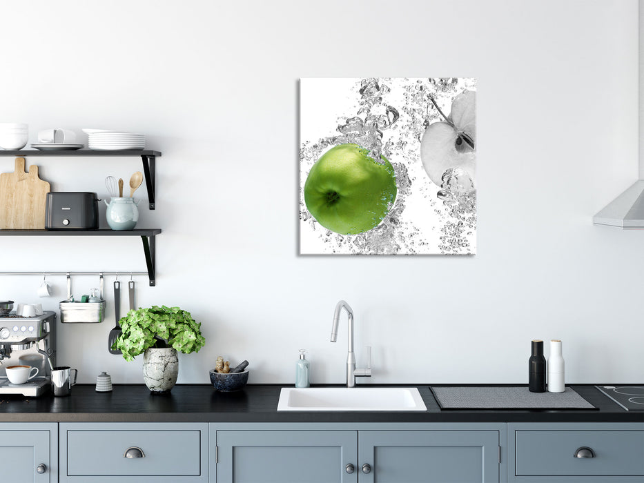 saftig grüne Äpfel im Wasser, Glasbild Quadratisch