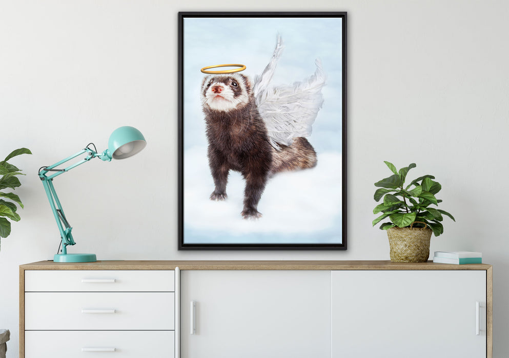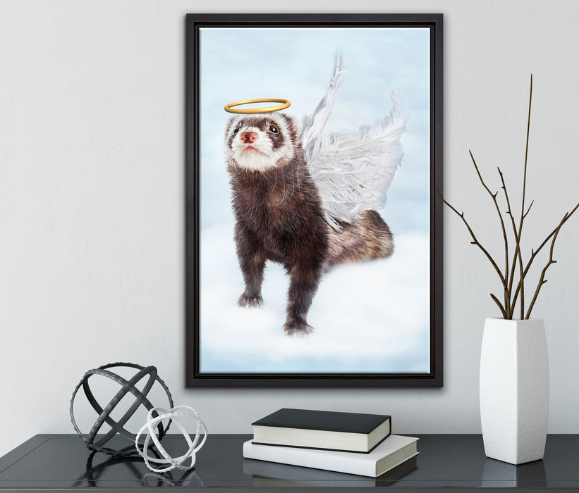 Süßes Frettchen im Engelsköstum, Leinwandbild mit Bilderrahmen