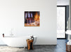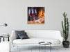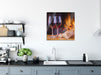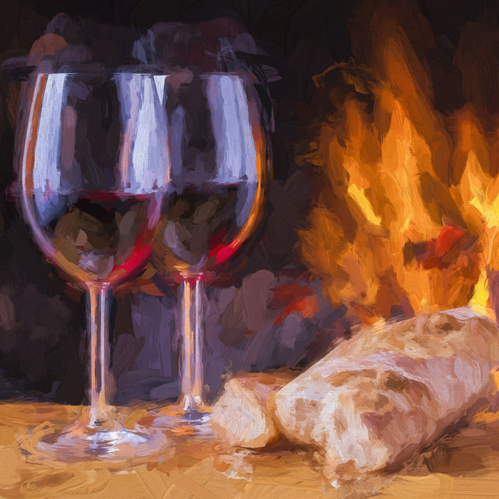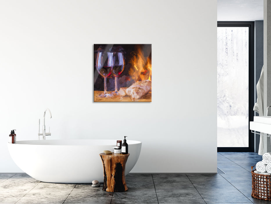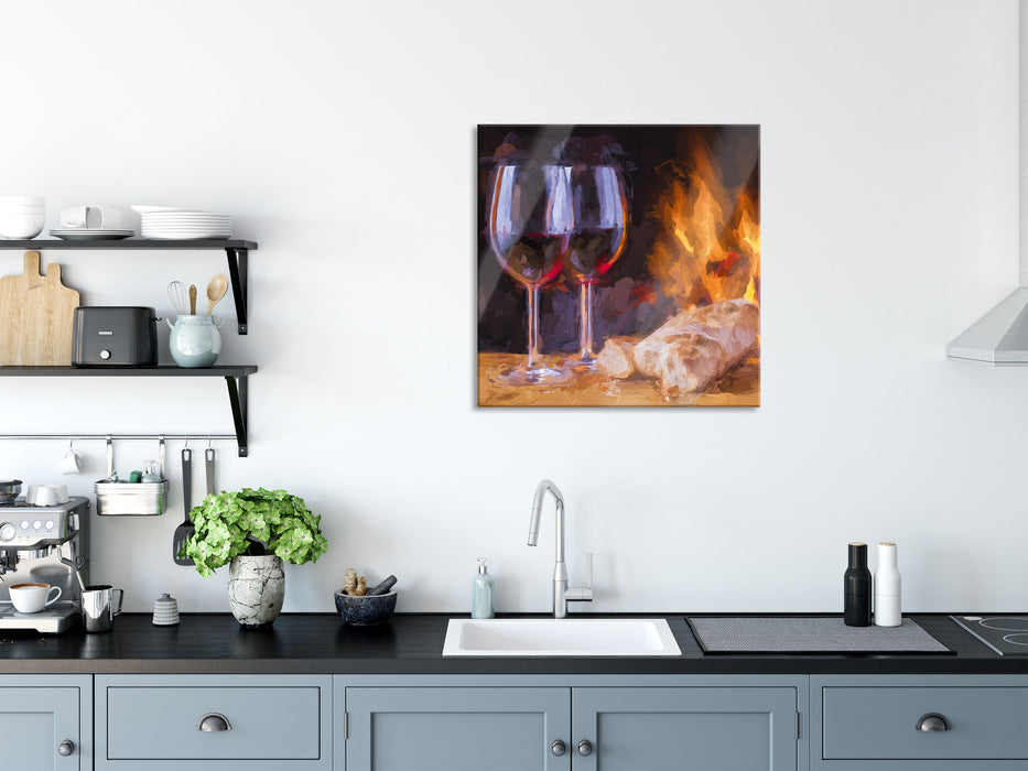 Wein und Baguette am Kamin, Glasbild Quadratisch